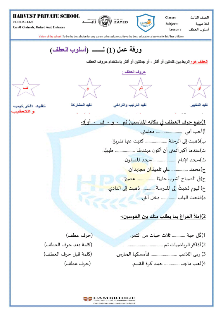 ورقة عمل حروف العطف في اللغة العربية الصف الثالث العلوم والتكنولوجيا