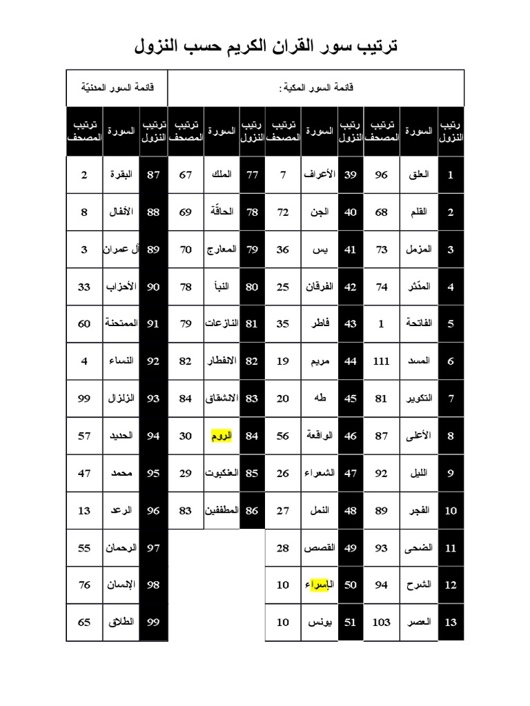 ترتيب السور حسب النزول. يعتبر القرآن الكريم أحد الكتب السماوي ة التي نزلت على سيدنا محمد صلى الله عليه وسلم عن طريق الوحي على شكل آيات متفرقة وكانت تتم كتابة هذه الآيات في عهد الرسول عليه أفضل الصلاة والسلام على الرقاع. 211 كتب علوم القرآن أسرار ترتيب القرآن ط. نقدم لكم في موضوعنا هذا لترتيب سور القرآن الكريم مع عدد أيات السور ومكان نزولها.