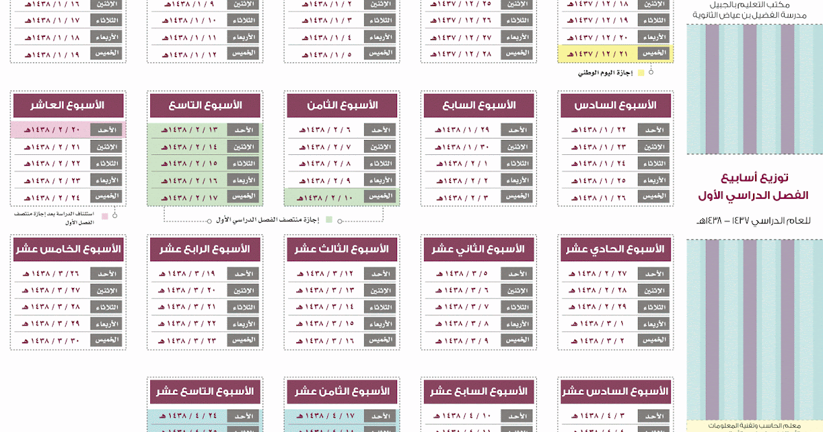 كل عام وأنتم بخير. التقويم الدراسي 1440 التفصيلي وتوزيع الأسابيع الدراسية المعتمد من وزارة التعليم. توزيع الاسابيع الدراسية الفصل. نقدم لكم ملفا يتضمن جدول توزيع الأسابيع الدراسية للفصل الدراسي الأول للعام 1442 هجري.