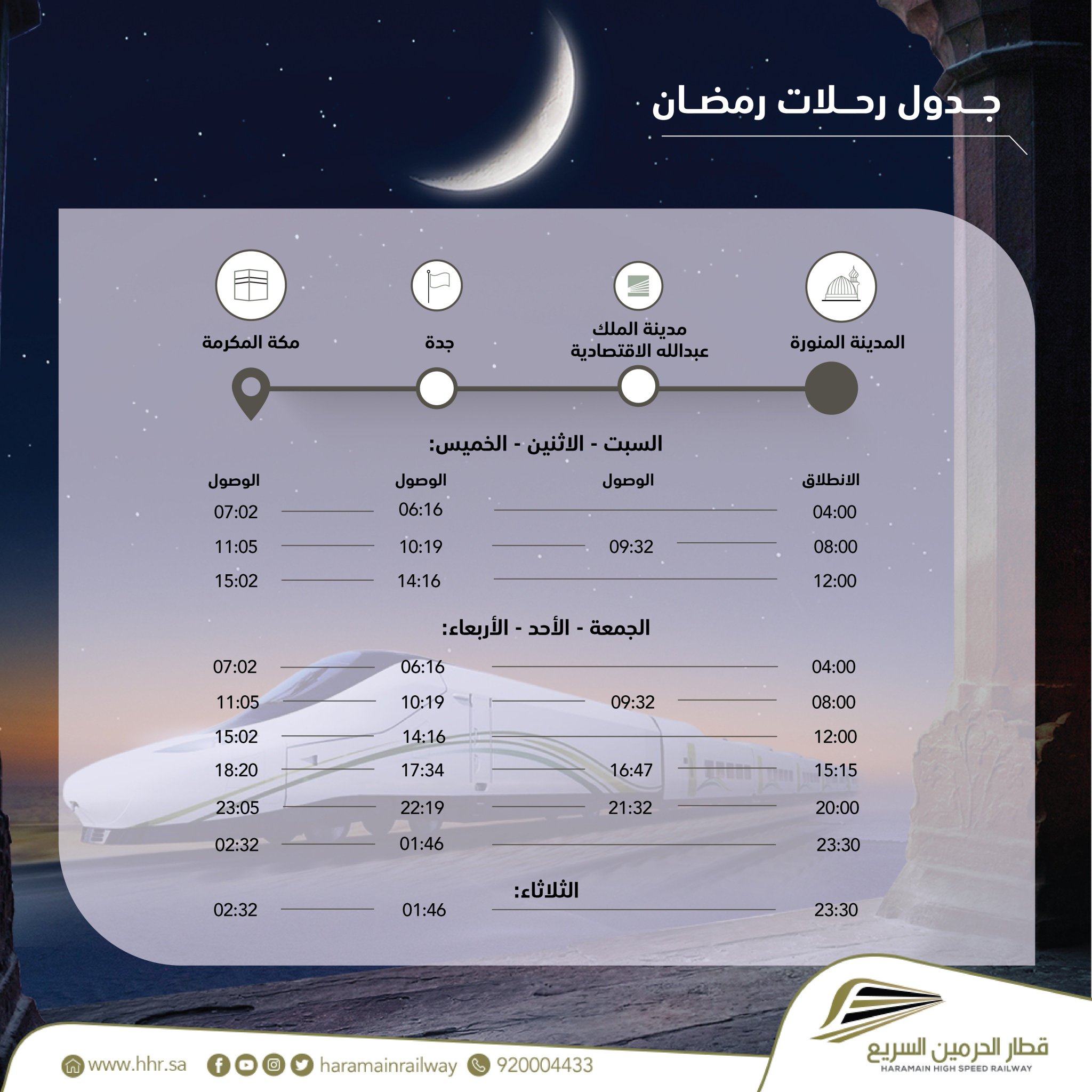 وبحسب بيان اصدرته شركة لـكونسوريوم الشعلة المسؤولة عن المشروع فإن القطار السريع بين الحرمين سينطلق في سبتمبر بواقع اربع رحلات اسبوعيا في أيام. جدول رحلات قطار الحرمين خلال شهر رمضان.