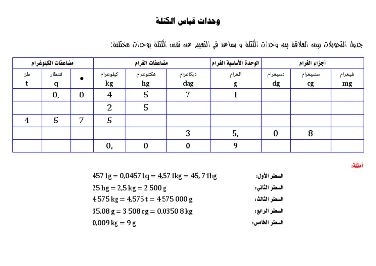 جدول تحويل وحدات قياس الكتلة